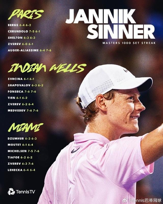 直播吧3月30日讯 数据显示,辛纳不失一盘,连续夺得3座大师赛冠军。